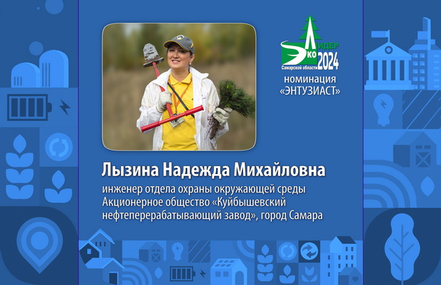 Лызина Надежда Михайловна после окончания СамГТУ работает на Куйбышевском НПЗ. Стояла у истоков экологического движения предприятия. С 2005 года организовывает и проводит экологические мероприятия для сотрудников и их семей, является активным волонтером по сегодняшний день.